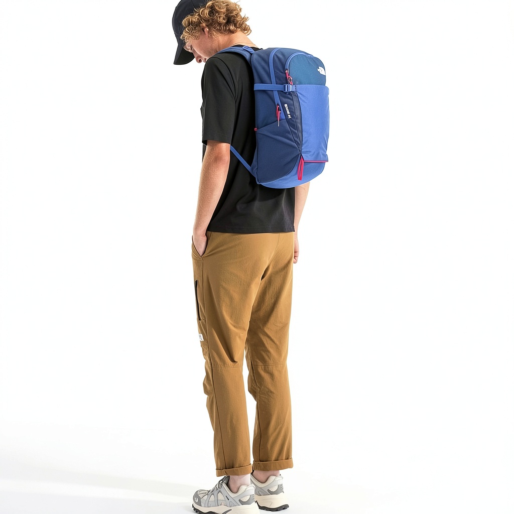 The North Face Basin 24L daypack combines durability and functionality for outdoor enthusiasts. Made from lightweight nylon ripstop and polyester with a Durable Water-Repellent (DWR) finish, it withstands tough conditions while keeping weight minimal. Key features include a NextVent back panel for breathability, an integrated rain cover, and multiple storage compartments, including a main zippered section with an internal hydration sleeve. Dimensions are 19.7 x 11 x 6.7 inches, with a weight of 1 pound and a 24-liter capacity, making it ideal for day trips and hiking adventures.