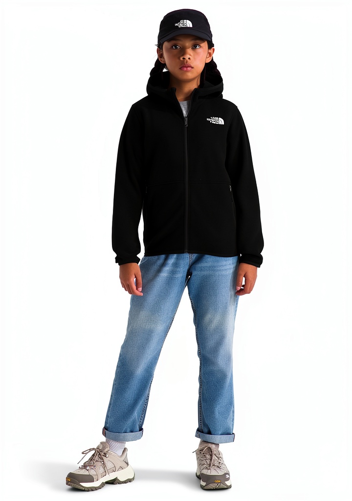 The North Face Glacier Full-Zip Hoodie is crafted for youth explorers, featuring 100% recycled polyester fleece that delivers softness and breathable warmth. With a regular fit and set-in sleeves, it ensures natural range of motion, while elastic binding at the hood, cuffs, and hem helps retain heat. This hoodie includes a reverse-coil zipper with chin guard to prevent chafing, secure-zip hand pockets, and embroidered logos. Model number NF0A8CVF, it is available in sizes from X-Small to XX-Large and colors like Tnf Black and Tnf Red/Sumac, meeting high sustainability standards with at least 75% recycled or responsibly sourced materials.